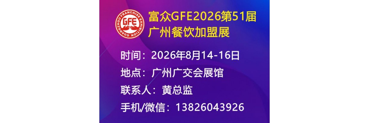 “富众GFE2026第51届广州国际餐饮加盟展”将于2026年8月14-16日在广州琶洲展馆举办,诚邀各餐饮连锁加盟企业参展。